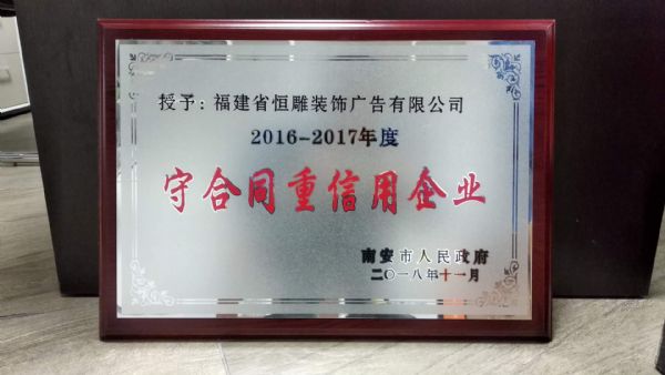 恒雕获得南安市人民政府颁发“2016-2017年度守合同重信用企业”荣誉。